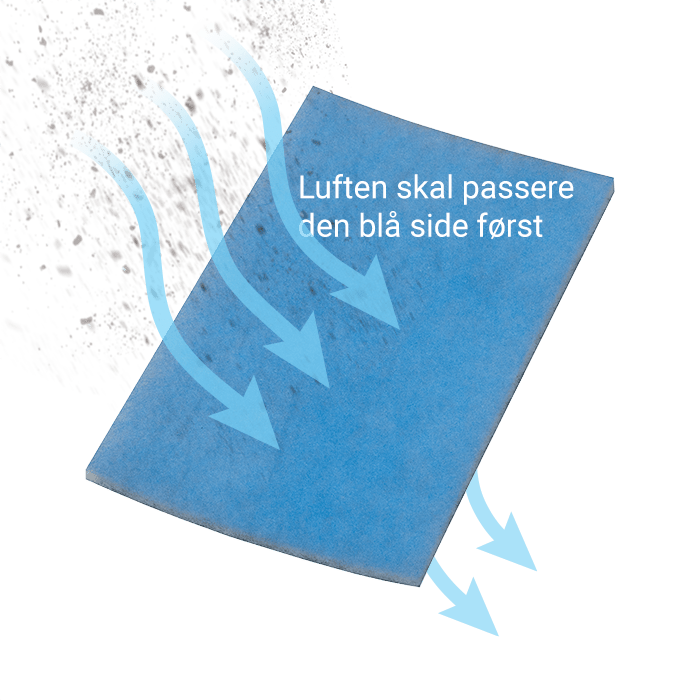 På alle vores panelfiltre sidder der et label med en pil der viser den vej som luften skal gå igennem filteret. Det vil sige at luften der kommer ind udefra, skal følge pilen, som skal vende mod krydsveksleren. Vores Planfiltre skal altid vende med den blå side op og den hvide ned.